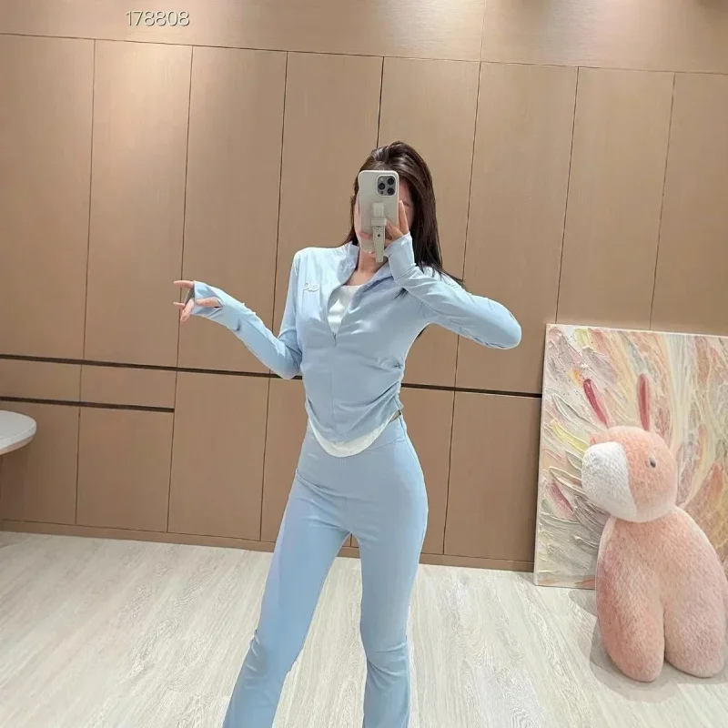 Home > ALO 2025 Stand-up Collar Fake Two-Piece Elastic Waist Flared Pants Casual Sports Suit (3 styles)-2579