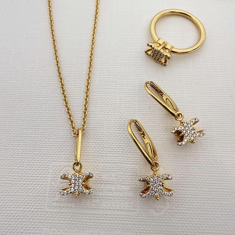Celine Gold Arc de Triomphe Full Diamond Logo Necklace Earrings-3736